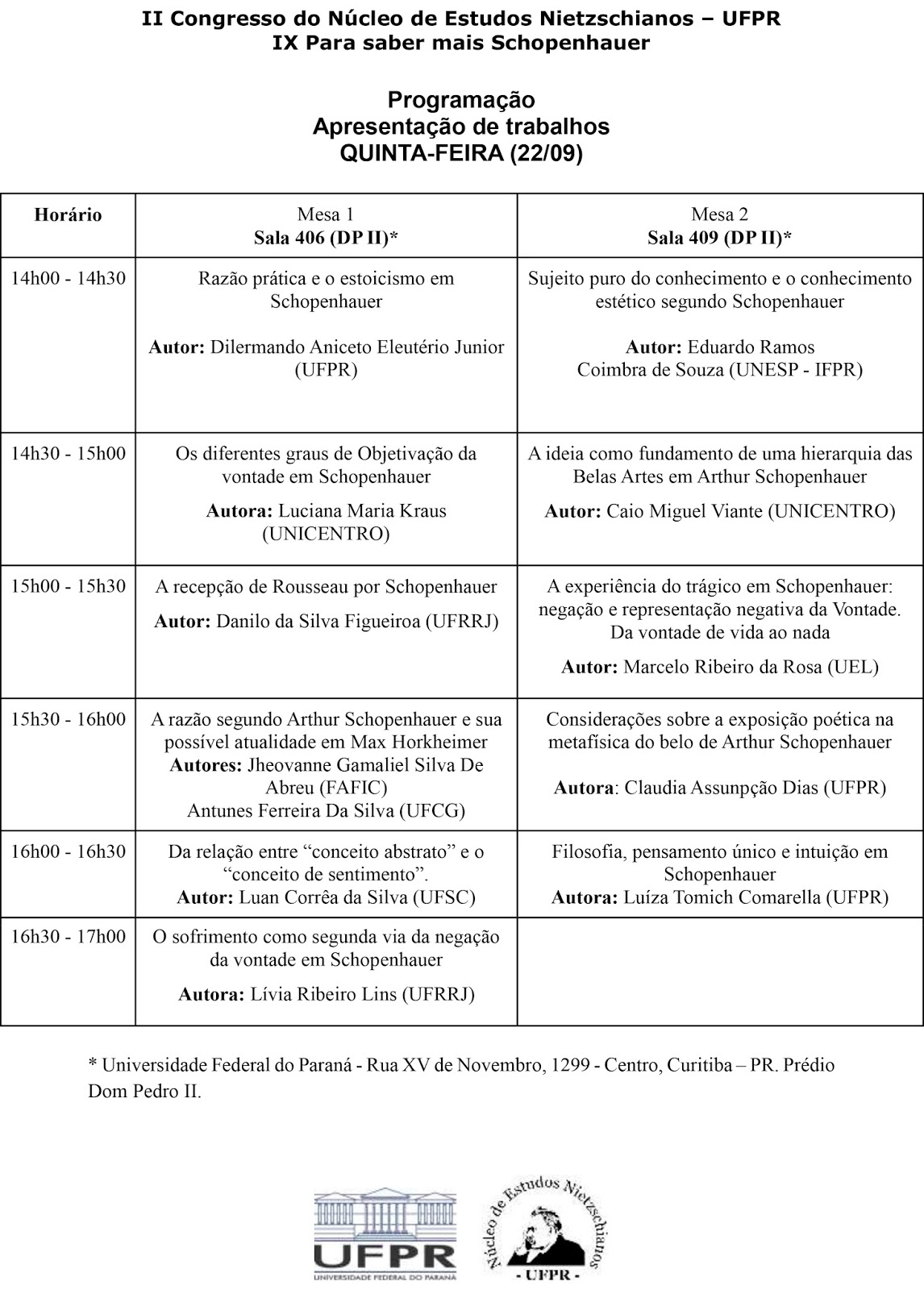 Em sua segunda edição, o “Congresso Nietzsche – UFPR” pretende novamente expandir o foco do debate para além da filosofia de Nietzsche. Este ano Editado em conjunto com o “IX Para saber mais Schopenhauer”, o propósito é fomentar a pesquisa nesses autores na graduação e pós-graduação da UFPR além de ampliar as bases para as pesquisas já existentes por meio de um aprofundamento de debates sobre temas correlatos aos dois filósofos. O congresso será composto por palestras, debates e apresentações de resultados depesquisa.