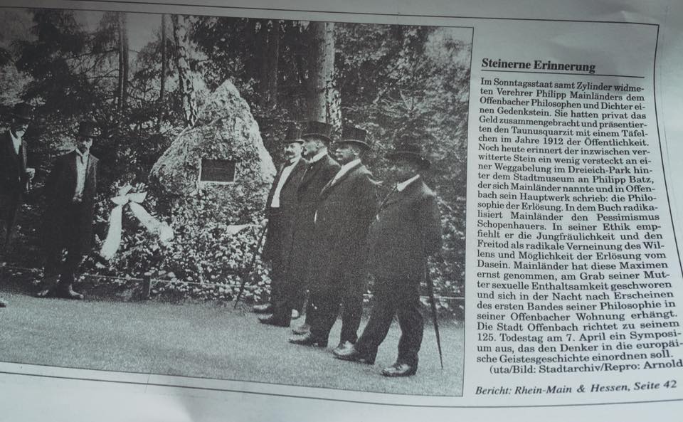 El congreso se clausuró con un agradable paseo por Offenbach am Main, ciudad que vio nacer y morir a Philipp Mainländer, donde los participantes visitaron lugares tan emblemáticos como la piedra colocada en 1912 en recuerdo de Mainländer. A continuación puede verse la nota de prensa: