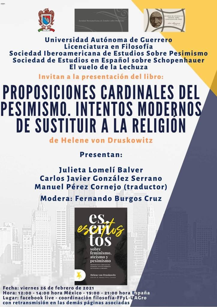 Olvidada durante décadas, el reciente avance del movimiento feminista obliga a recuperar la figura y el pensamiento de la filósofa y escritora austríaca Helene von Druskowitz. Adalid del movimiento emancipatorio de las mujeres, Druskowitz mantuvo relación con algunos de los principales protagonistas literarios y filosóficos de la segunda mitad del siglo XIX y principios del XX, como Rilke, Lou Andreas-Salomé y, sobre todo, Nietzsche, con quien mantendrá una breve relación de amistad, que terminaría con la ruptura entre ambos. Partidaria de un ateísmo radical, Druskowitz aparece también como una de las principales representantes del pesimismo filosófico. Una audaz síntesis de pesimismo y feminismo que, además de lanzar un terrible anatema contra nuestra cultura, busca superar la secular violencia ejercida por el varón ―al que define como una “maldición para el mundo”― contra la naturaleza y la mujer mediante la supresión de matrimonio, el antinatalismo y la separación tajante de ambos sexos.