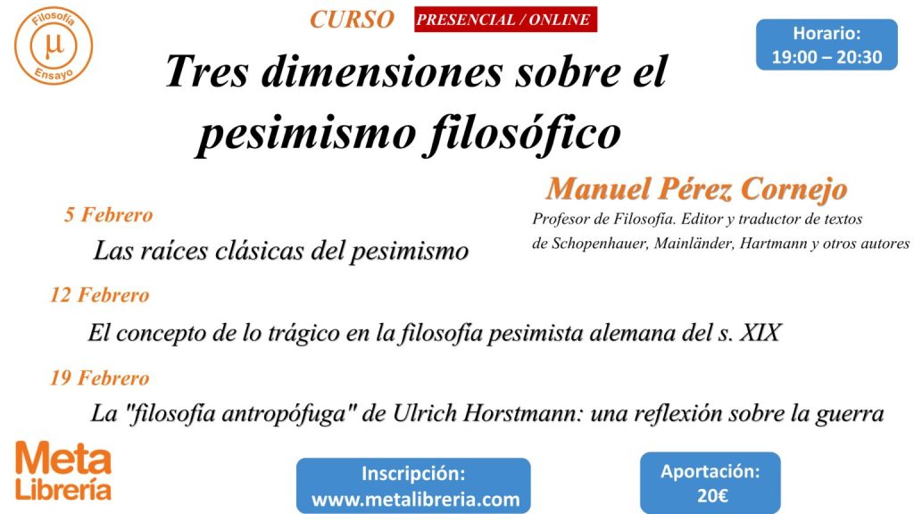 Curso «Tres dimensiones sobre el pesimismo filosófico» Carlos Javier González Serrano / 2 febrero, 2025 Toda la información, en la web de Meta Librería (Madrid). El curso podrá seguirse en línea. Comparte:Tweet Compartir en Telegram (Se abre en una ventana nueva) Telegram Compartir en WhatsApp (Se abre en una ventana nueva) WhatsApp Imprimir (Se abre en una ventana nueva) Imprimir Me gusta Cargando...